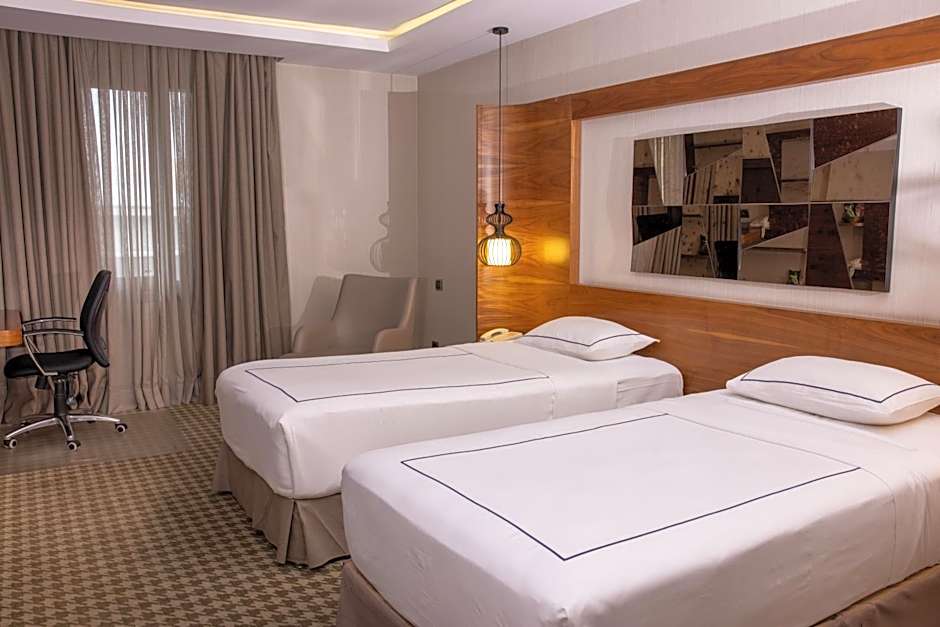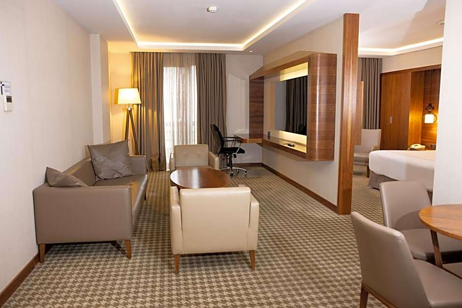 This suite is consisted of of 1 living room, 1 separate bedroom and 1 bathroom with a shower and free toiletries. The air-conditioned suite offers a flat-screen TV with satellite channels, soundproof walls, a mini-bar, a tea and coffee maker as well as city views. The unit offers 2 beds.